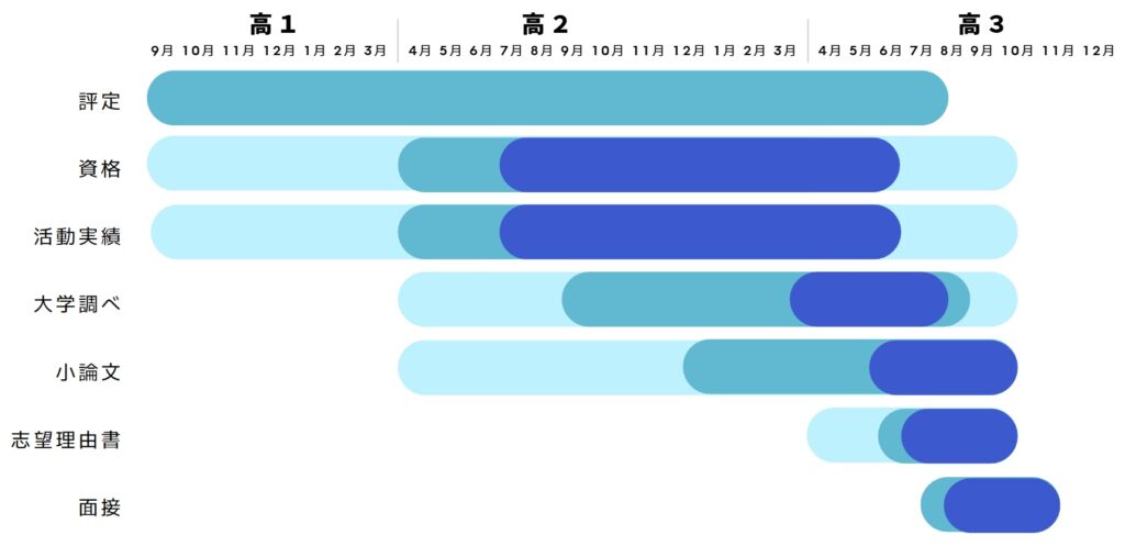 活動実績のことを鑑みると、高2の9月頃から始めればかなりのものが積み上げられます。またこの時期から始めれば、資格対策や小論文対策など、他の対策に掛けられる時間も十分とれます。