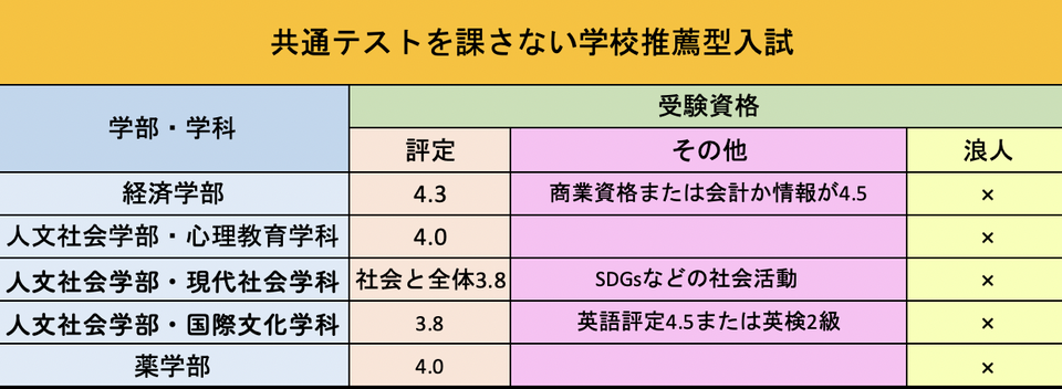 以下の表は名古屋市立大学の学校推薦型入試における出願資格を、学部・学科によって分けたものです。
