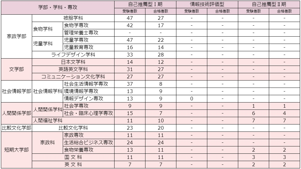 この総合型選抜(自己推薦型)は、家政学部食物学科食物学専攻で小論文が行われるものの、他の学部学科では提出書類と面接で合否が審査されます。