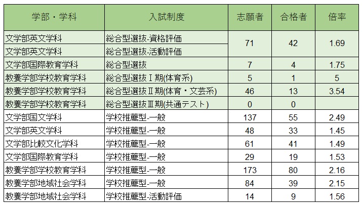 以下の表は総合型選抜と学校推薦型選抜の入試結果です。都留文科大学のHPを見ると、総合型選抜の英文学科と国際教育学科は受験者と合格者が同数になっています。これは、志願者がエントリー試験を受け、それに合格した者のみが正式に出願できるという形式をとっているためです。