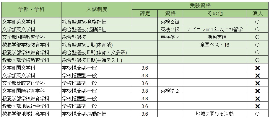 以下の表は都留文科大学の総合型選抜と学校推薦型選抜における出願資格を、入試の方式や学部・学科によって分けたものです。